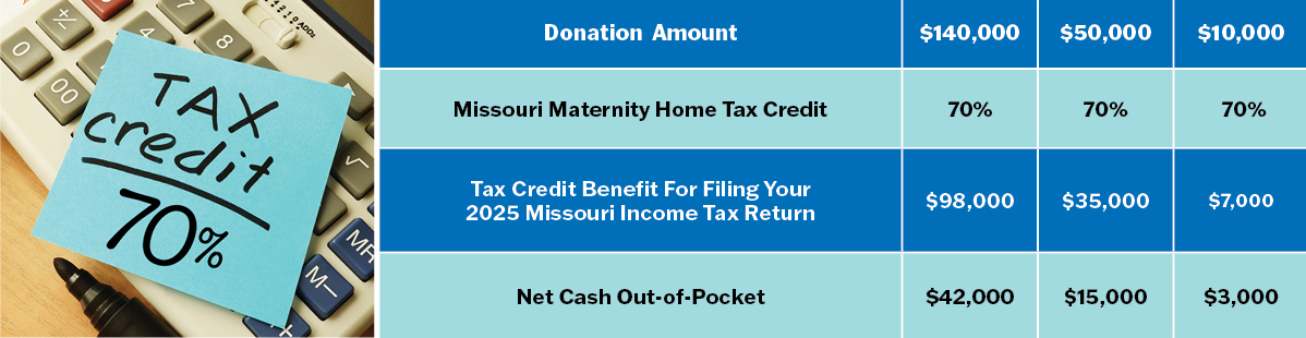 As with most charitable donations, the donor may claim a federal income tax deduction. The Missouri Maternity Home Tax Credit allows the donor a credit equal to 70% of the monetary contribution to Our Lady’s Inn. This credit is applied against the donor’s Missouri state tax liability. Donors may claim up to $100,000 for a Maternity Home Tax Credit which equates to a $142,857 donation. The Missouri Maternity Home Tax Credit application must be submitted within one year of the donation date. The credit may be carried forward one year.